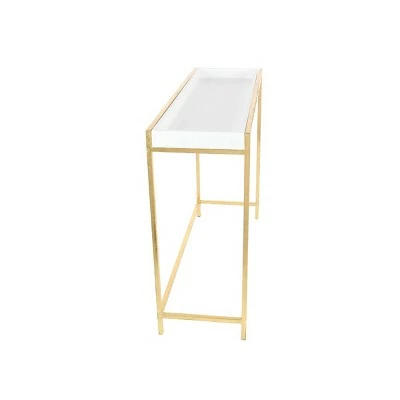 - Features porcelain white-painted tray tabletop with metallic gold frame finish