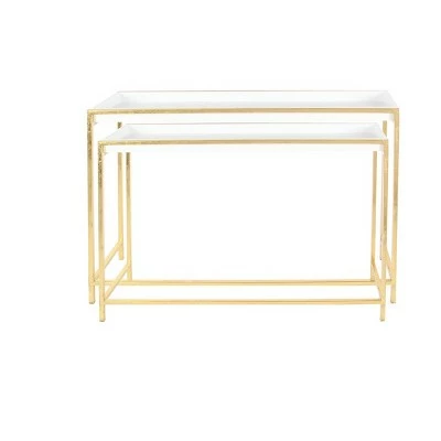 These metal nesting end tables can serve as furniture side tables, figurine display holders, corner accent pieces, play room tables, floor potted plant complements. Bring a finishing touch to your home with an inviting appeal with this console table. A sturdy and long lasting construction that for a years of enjoyment. Designed with protective stoppers at the base that prevent scratching furniture and table tops, as well as sliding around. Suitable for indoor use only. Maximum weight limit is 100 lbs. This set includes 2 console table. Contemporary design.