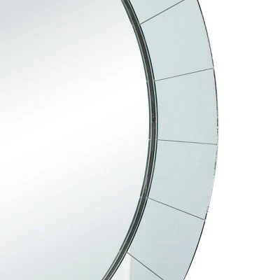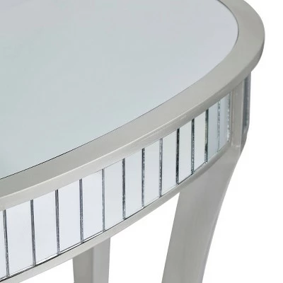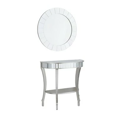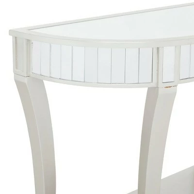 Get organizing with this half circle console table and add a dash of sparkle to any of your home spaces. Useful and elegant, console tables are more than just a place to throw your mail. Bring a finishing touch to your home with an inviting appeal with this console table and mirror set. Designed with rubber stoppers to prevent scuffing and sliding. This item comes shipped in one carton. Wooden table is detailed with mirror overlay and furnished with a flat bottom shelf. Suitable for indoor use only. Glam inspired. Maximum weight limit is 100 lbs.
