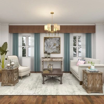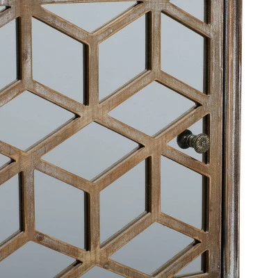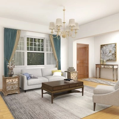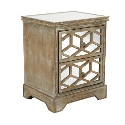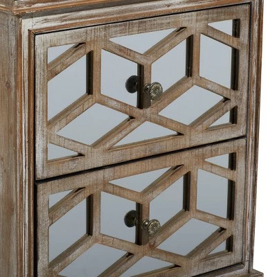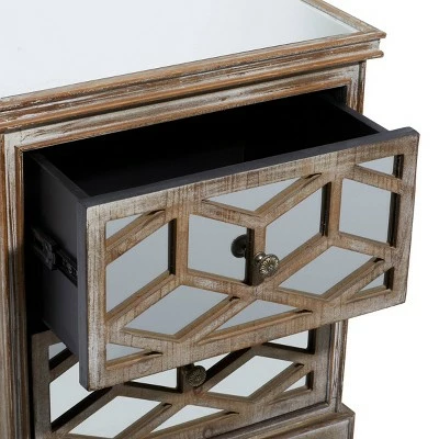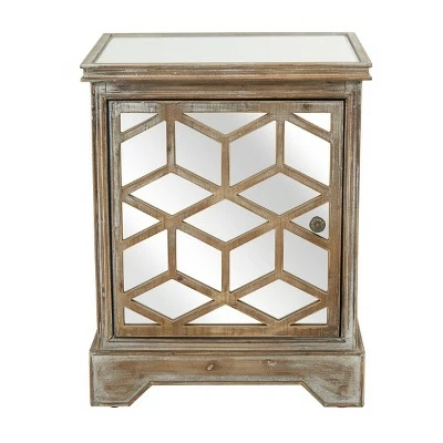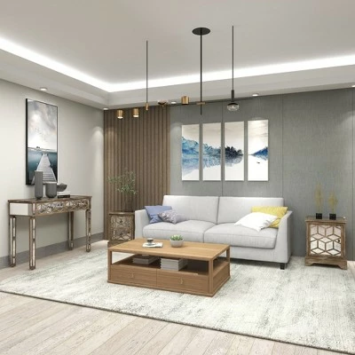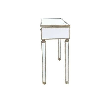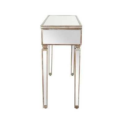 - A glam-style wood console table and two short cabinets with mirror tops and front accents