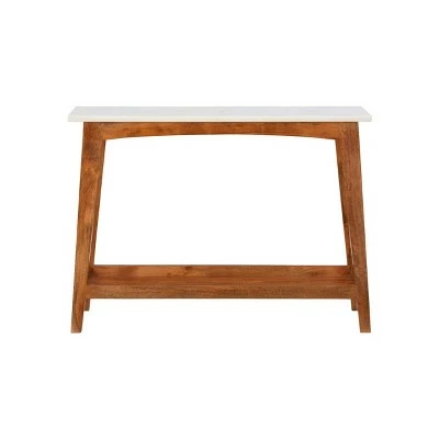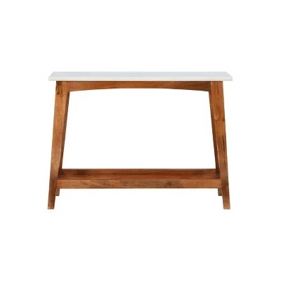 Whether welcoming guests into your home or nestled up behind your sofa, this console table will always be a stylish stage. Crafted from solid mango wood, its frame features flared legs, an open lower shelf, and a warm hazelnut finish for a natural touch. Up above, the narrow rectangular top features a gorgeous and durable white marble slab creating contrast. This design provides the perfect place to display your favorite lamp, vase, or candles below a beautiful piece of art.