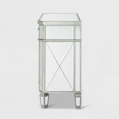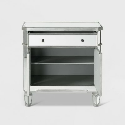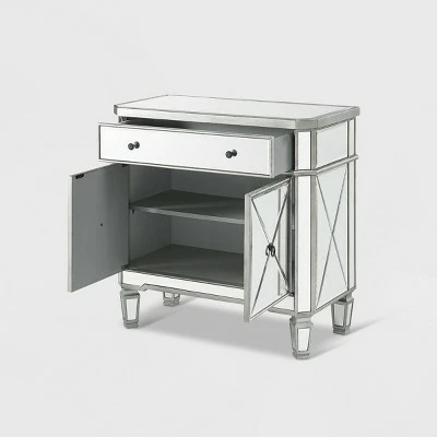 The Mirrored Console is the perfect compliment to your home. Featuring one drawer and two doors, this piece provides ample storage space with an interior, fixed shelving unit. The gray wood and mirror surfaces are highly adaptable to any homes decor. The unique details are eye catching, enduring, and are sure to enhance any space. Fully assembled.