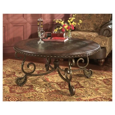 Surrounding yourself with beautiful things is perfectly embodied by this coffee table. The spectacularly finished metal and nailhead-accented top is supported by a scrolled metal base in an antiqued tone. Signature Design by Ashley is a registered trademark of Ashley Furniture Industries, Inc.
