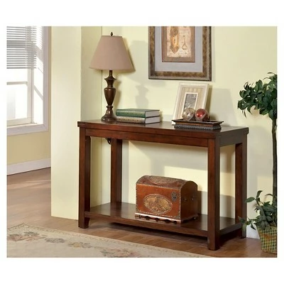 Furniture of America Sineca Simple Natural Wood Grain Sofa Table in Dark Cherry presents a stylish sophistication to your already chic home décor. The simple design of this piece easily allows you to dress it up with fancy pieces like books or your favorite trinkets. Sleek lines and spacious shelf space provides ample storage area. Furniture of America Sineca Simple Natural Wood Grain Sofa Table in Dark Cherry is complete with sturdy slim wood block legs.