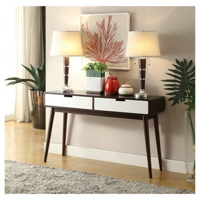 Complement your mid-century decor aesthetic with the storage and display space of the Walnut White Sofa Table from Acme Furniture. Tapered legs add retro flair as it supports a dark wood tabletop, offering stunning contrast against the two white drawers. This beautiful wood sofa table provides the perfect addition to your entryway or living room, adding extra hidden storage in the two drawers or space for displaying your favorite decor on the spacious top.