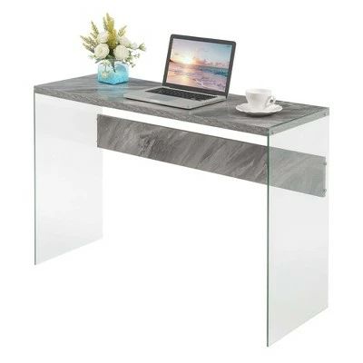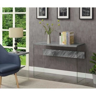 Strike a pose with this chic SoHo Console Table/Desk by Breighton Home. Clean lines and an elegant silhouette will bring any living space from gloom to glam with this modern piece! The sturdy tempered glass side frame gives the illusion of a floating shelf, effortlessly drawing attention to your favorite décor. This stylish unit is also crafted with hollow core and particleboard finished with a rich melamine laminate. A beautiful unit like this has much versatility and can be used as a console table, desk, or vanity. Bring your favorite living space to life right after delivery with the easy 3-step assembly. Coordinate with additional modern pieces from the SoHo Collection by Breighton Home, each sold separately.