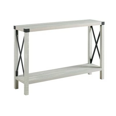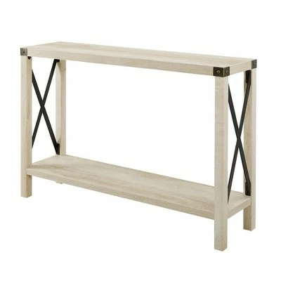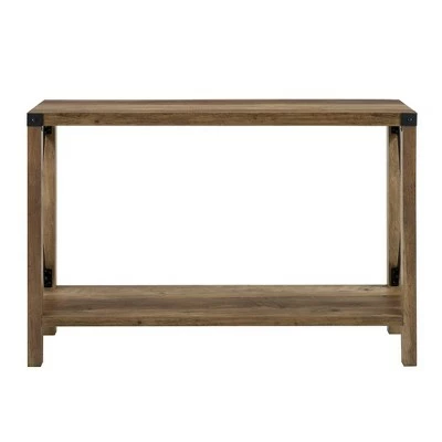 Reinvent your living room or entryway with the Sophie Rustic Farmhouse X-Frame Entry Table from Saracina Home. Metal corner brackets and X-side accents foster a country-inspired, homey feel that greets you each time you walk in the door. Decorate the tabletop with vases, house plants, or an accent mirror, and fill the lower shelf with toy bins, shoes, or seasonal decor. Pair with other pieces from Saracina Home’s Sophie collection to tie your space together.