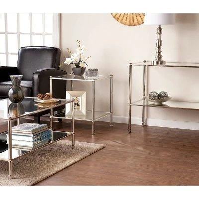 Sprinkle a pinch of shimmer in your home with this reflective silver console table. Grand mirrored shelf struts everything from flower arrangements to glassware while broad tabletop displays a chic lamp or your favorite perfume bottles. Craft a glamorous décor update with this multitasking console table behind the sofa, in your dining room as a buffet, or in the dressing area as a grab-and-go toiletry station.