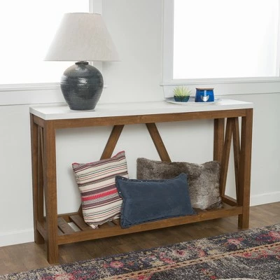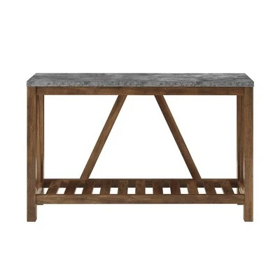 Invite a bit of barn-inspired beauty into your home with this rustic entry table from Saracina Home. With an uncomplicated A-frame detail on three sides of the piece you ‘ll be met with the warmth and cozy appeal of modern farmhouse design every time you open the door. This country style credenza is great for entrance ways since it not only has a long table top where you can keep your keys or daily mail but it also has a lower slat style shelf that is ideal for keeping shoes or packages.