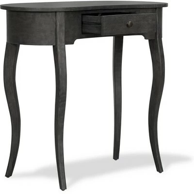 Make a statement in your living room or entryway with this charming and versatile console table. The classic design style ensures this piece always has a place in your home. Available in a sophisticated dark gray finish that’s sure to impress. The timeless curved wood legs of this design will never go out of style. Enjoy its economical and great looking wood construction. The decorative antiqued hardware is as striking as it is durable. With a distinctive oval table top for a timeless and stylish look.
