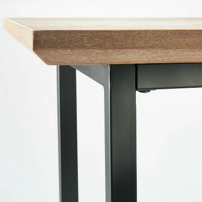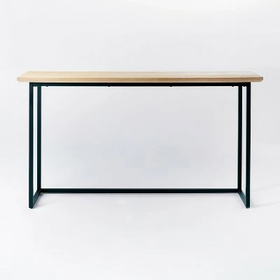 The Hidden Hills Mixed-Material Console from Threshold™ designed with Studio McGee makes a stylish addition to your home. This rectangular accent table features a smooth wood-finish tabletop in brown supported on a slender metal frame in black, which provides an elegant pop of contrast. The metal legs are joined at the base on three sides, forming an open-geometrical design for additional support and style. Stage it in the hall, foyer or behind the living room sofa with your favorite decorative items, greenery and family photos for a splash of your personal touch.