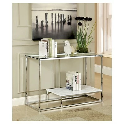 HOMES: Inside + Out Tressie Chrome Glass Top Sofa Table in White will add a unique finishing touch to your home decor. A slim chrome frame with an open base bottom upholds the 8mm tempered glass table top. An attached raised bottom unit, complemented by a contrasting carved top shelf, adds a dimension as well as additional space to this piece. The HOMES: Inside + Out Tressie Chrome Glass Top Sofa Table in White is crafted of a durable metal construction.
