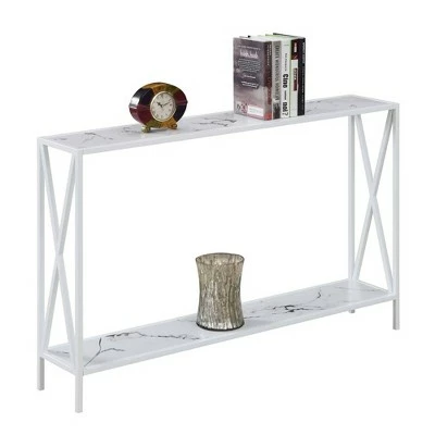 The Tucson Console Table with Shelf by Breighton Home is a great addition to any home. This table features generous top surface space as well as a bottom shelf that will provide plenty of room to display décor and collectibles. The frame of this console is built out of sturdy powder-coated metal and the shelving is engineered from particleboard and melamine for long-term durability. Bring home the unique design of the Tucson Console thanks to the modern crisscross frame and shop the complete collection by Breighton Home, each sold separately.