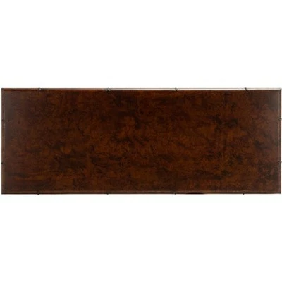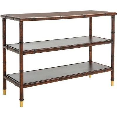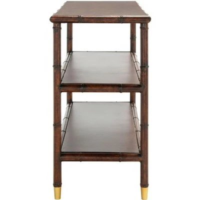 This Tudor Console table reinterprets antique Chinoiserie elegance for todayÕs classic-contemporary interiors. A bamboo-inspired dark brown wood frame is further enhanced by the intriguing, flowing wood grain, while gold steel caps make Tudor a modern heirloom. Two shelves provide ample storage and display. Care Instructions: Dust regularly with a soft, dry cloth. Never use oiled or treated cloths on lacquered finishes. Some finishes can be wiped with a damp (not wet) cloth, followed at once by rubbing with a dry cloth to remove fingerprints and smudges. For persistent spots, gently clean with a soft cloth and a solution of water and mild soap, make sure to wipe dry. Use adhesive felt pads, coasters and placemats to protect your furniture.