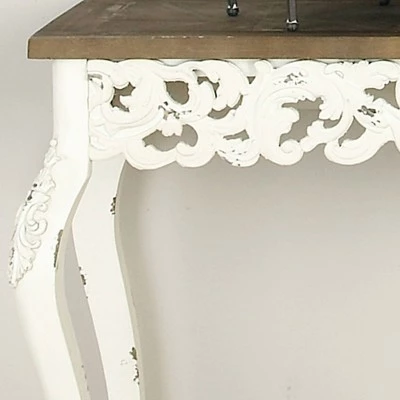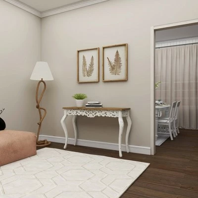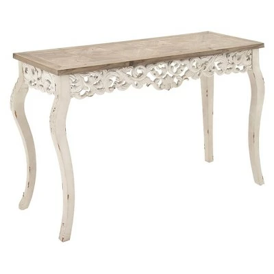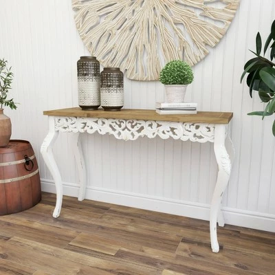 This farmhouse style inspired design white birch wood carved console table will set a great first impression when displayed in entryways with matching Decor. Bring a finishing touch to your home with an inviting appeal with this console table. A sturdy and long lasting construction that for a years of enjoyment. Suitable for indoor use only. Some assembly required. Maximum weight limit is 75 lbs. Farmhouse theme.