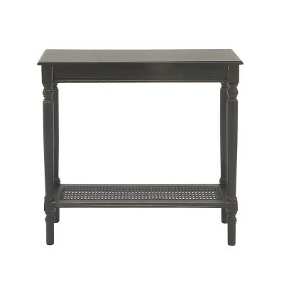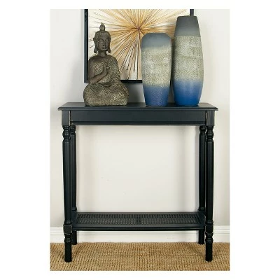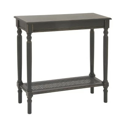 - This traditional style black wood console table features refined lines and edges in its rectangular surface fixed with round and curved legs reinforced by a lattice shelf
